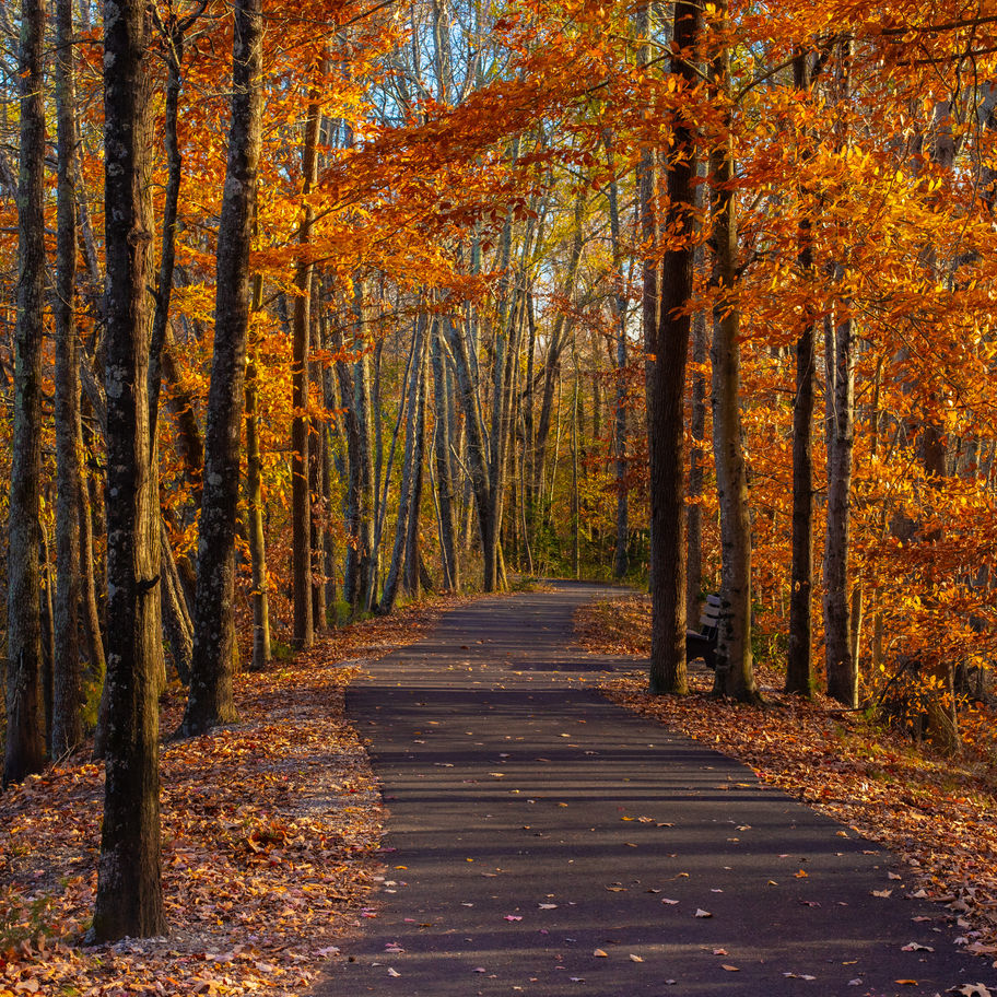 This inviting autumn landscape captures a quiet forest path bathed in warm, late-day light. A smooth paved walkway leads the eye into the distance, gently curving between tall tree trunks that rise on both sides like natural columns. The canopy is ablaze with rich tones of copper, amber, and gold, while a soft carpet of fallen leaves lines the edges of the path. Sunlight filters through the branches, casting long shadows and dappled highlights across the pavement, enhancing the sense of depth and direction. The scene feels peaceful and welcoming, evoking the simple pleasure of an unhurried walk through the woods at the height of fall color.